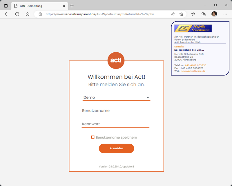 Durch die Möglichkeit eines parallel betreibbaren Netzwerk- und Web-Einsatzes kann diese Lösung in vielen Fällen die Einrichtung einer Offline-Synchronisation ersparen und damit die Act!-Administration deutlich entlasten. Dennoch bleibt auch die Möglichkeit der Synchronisation als Instrument des verteilten Datenzugriffs erhalten. Während die Administration der Datenbank (Benutzerverwaltung, Feldanpassungen) in der Masterdatenbank auf einem Windows-Server vorgenommen wird, stehen die meisten, aus der Windows-Anwendung heraus bekannten Act!-Funktionen für den täglichen Gebrauch auch in der Web-Zugriffs-Lösung (MS-Internet-Explorer oder Google Chrome als Web-Browser) zur Verfügung (s. Systemvoraussetzungen). Melville-Schellmann hat für Sie einen kostenlosen Testzugang zu einer gehosteten Act! Premium for Web - Datenbank eingerichtet, welchen Sie hier anfordern können.